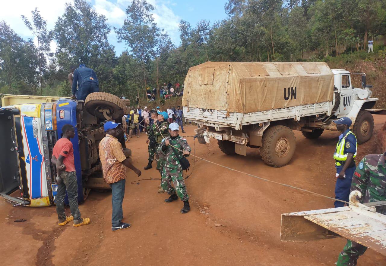 Kecelakaan tunggal truk bermuatan 30 warga sipil dan penuh dengan bahan makanan pokok mendapat perhatian Satuan Tugas (Satgas) TNI Kontingen Garuda (Konga) XXXIX-B Rapid Deployable Battalion (RDB) Mission de l Organisation des Nations Unies pour La Stabilisation en République Démocratique du Congo (MONUSCO) membantu evakuasi.
