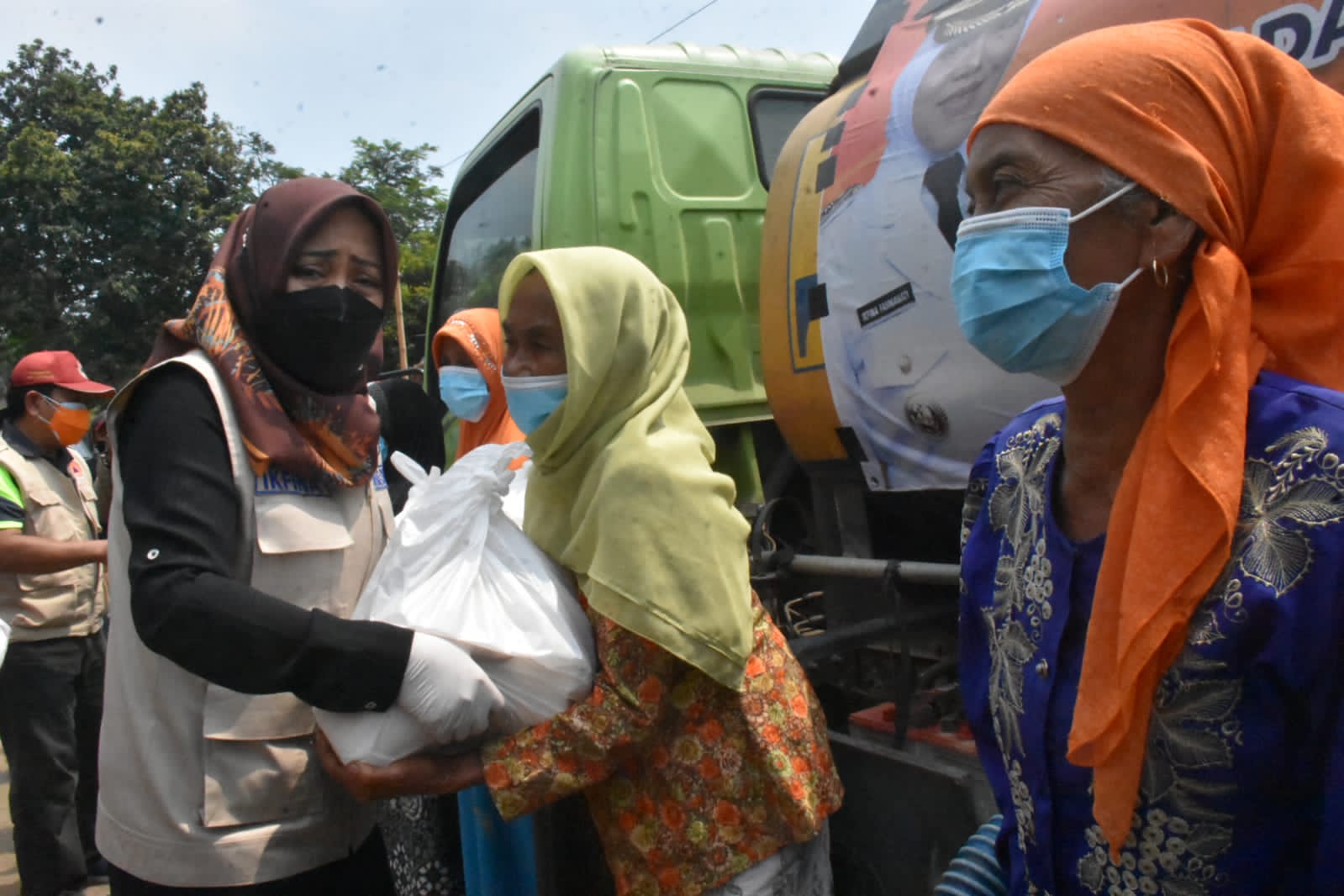 IM.com – Bupati Ikfina Fahmawati didampingi Kepala Pelaksana Badan Penanggulangan Bencana Daerah (BPBD) Ludfi Ariyono, membagikan langsung distribusi air bersih bagi warga di tiga RT Dusun Kandangan Desa Kunjorowesi Kecamatan Ngoro, Sabtu (4/9-2021) pagi.