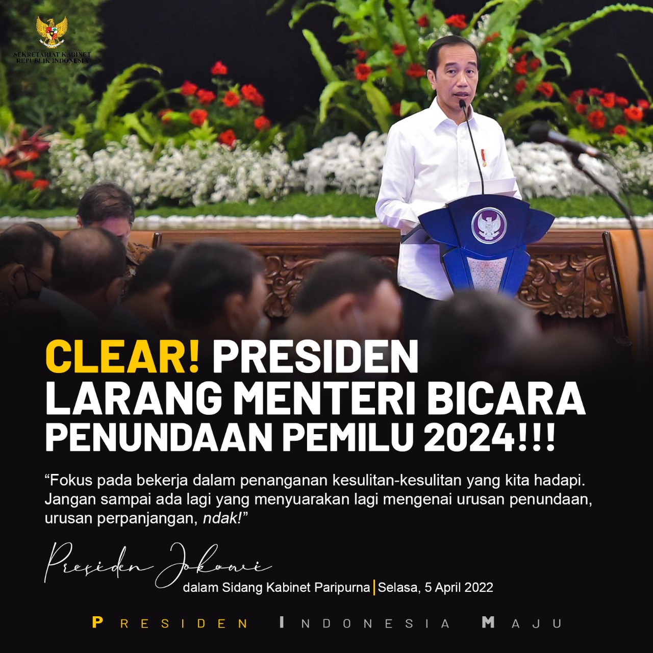 “Jangan sampai ada lagi yang menyuarakan mengenai urusan penundaan dan perpanjangan… ndak,” kata Presiden Joko Widodo (Jokowi) ketika membuka sidang rapat paripurna yang ditayangkan secara virtual pada Rabu (6/4/2022).