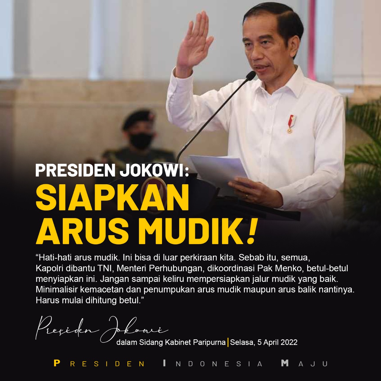 “Jangan sampai keliru mempersiapkan jalur mudik yang baik, dan bisa meminimalisir kemacetan dan penumpukan arus mudik maupun arus balik nantinya. Harus mulai dihitung betul. Ini bisa, kalau yang saya tangkap di bawah, ini semuanya ini mau mudik semua. Jadi, persiapannya juga harus ekstra,” paparnya.