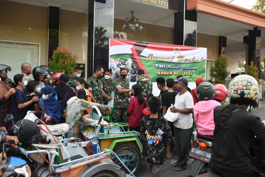 Kegiatan Jumat berkah dilakukan Danrem dengan membagikan paket buka puasa kepada abang becak dan para penjual serta pembeli yang berada di sekitar alun alun Kota Mojokerto.
