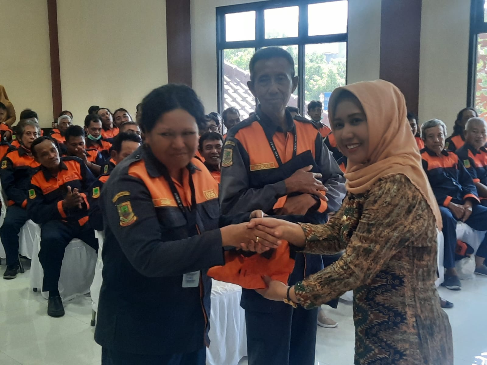Penyerahan seragam dan topi juga tanda pengenal secara simbolis oleh Wali Kota Ika Puspitasari kepada dua petugas juru parkir berlangganan di Kantor Kelurahan Jagalan Jalan Bhayangkara Kota Mojokerto, Senin (12/06-2023).