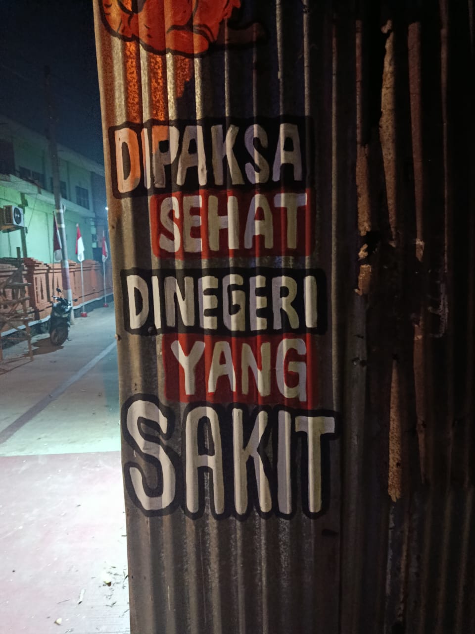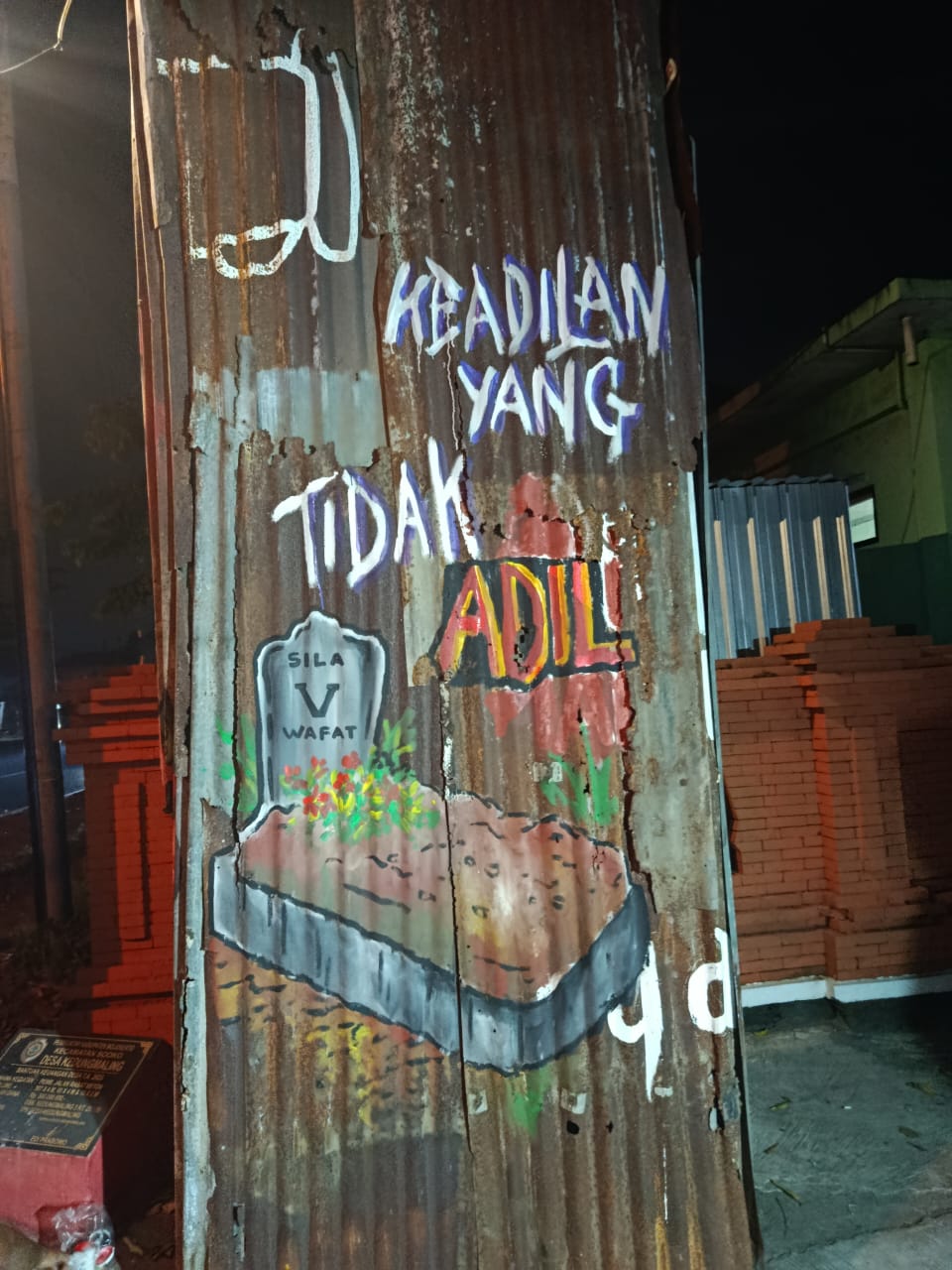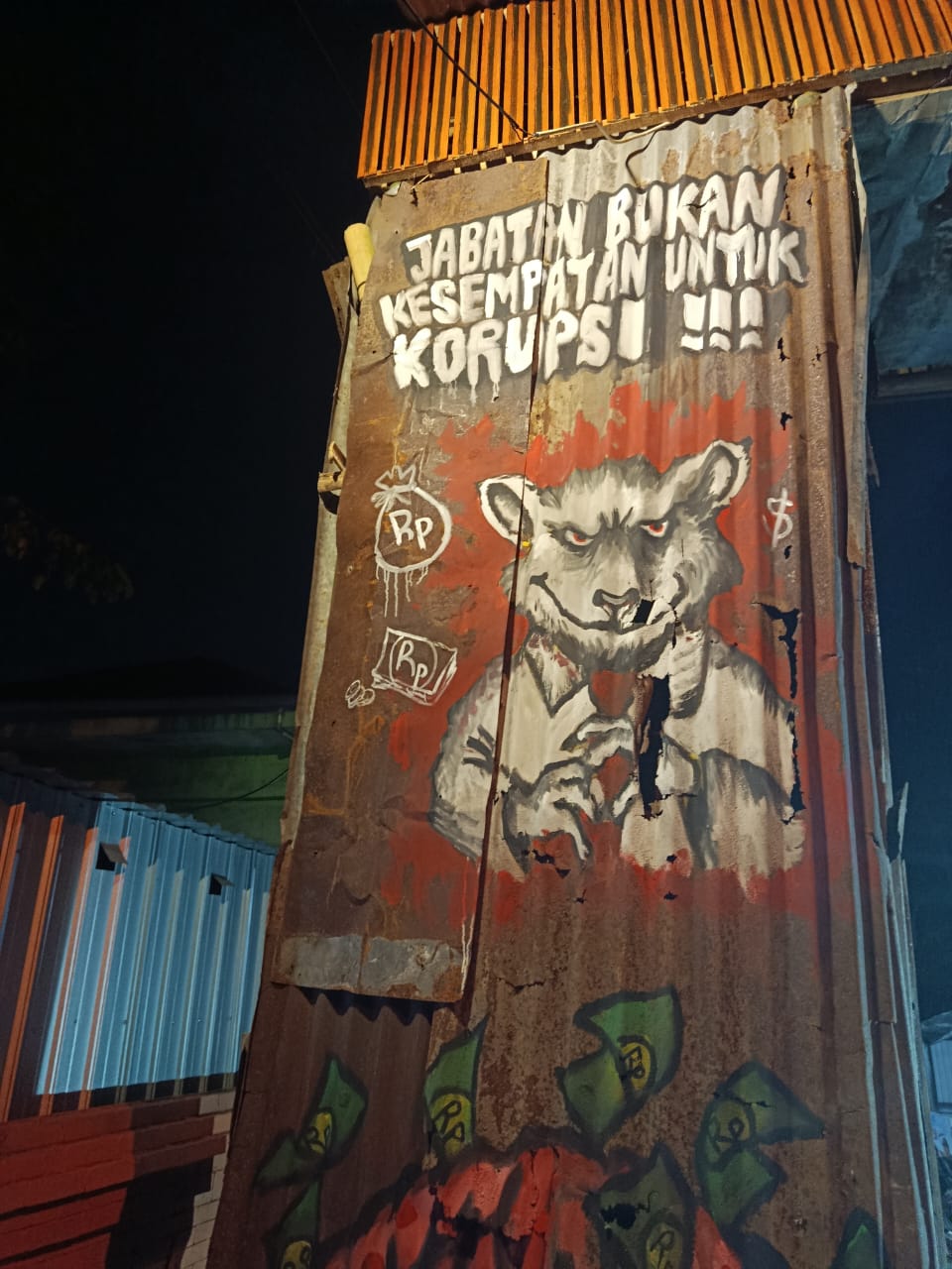Di antara goresan cat, terselip pula kalimat-kalimat yang memancing renungan, salah satunya berbunyi, ‘Penguasa makan uang, rakyat makan utang’. Bagi Basuki, itu bukan sekadar slogan, melainkan cerminan realita yang dirasakan warganya.