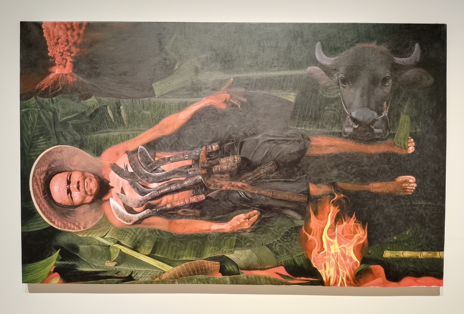 Di pameran kali ini, dua lukisan utama menjadi pusat perhatian. Figur perempuan tua dengan dada dipenuhi kempul, jagung dan rempah, berpadu dengan api di kaki dan sabit di kepala. Wajahnya tanpa senyum, hanya kepasrahan.