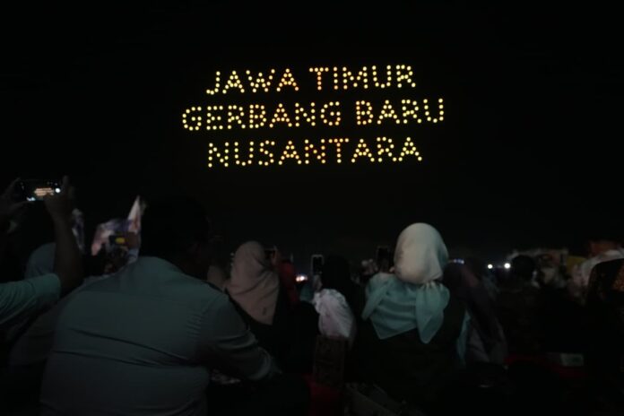 Wali Kota Mojokerto Ika Puspitasari hadir secara langsung bersama Wawali Rachman Sidharta Arisandi juga Bupati Mojokerto Al Barra. Bersama warga Bumi Majapahit menikmati pertunjukan drone show di langit Trowulan.
