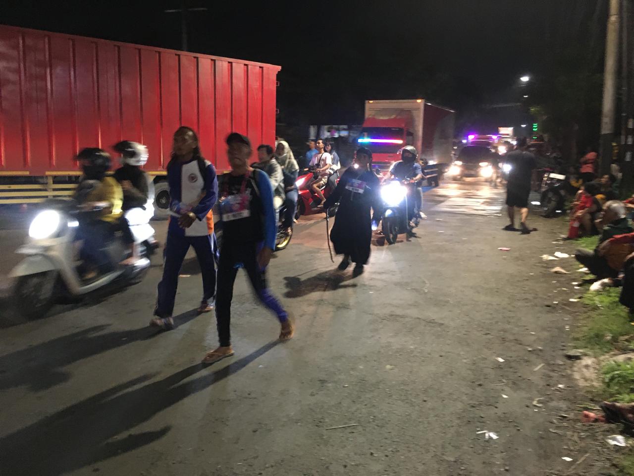 Setiap meter terasa berat, pejalan kaki harus berbagi ritme dengan mobil dan sepeda motor yang padat, saling berebut ruang yang sama sempitnya dengan jalur yang harus dilalui peserta.