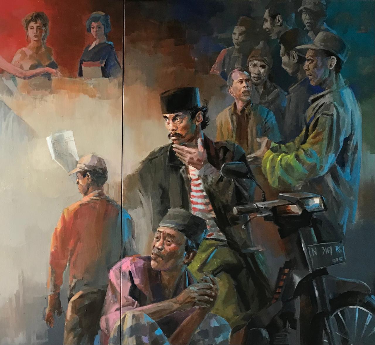 Badri piawai meniupkan drama lewat pencahayaan. Pada lukisan ada pendar cahaya hangat di sisi kiri beradu dengan warna dingin di kanan, memetakan konflik batin para tokoh.