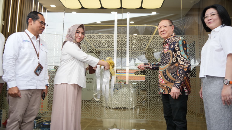 Peresmian Kantor BNI Benteng Pancasila ditandai pemotongan pita oleh Wahju Kusumaningtyas Regional Business Support Department Head (RBS Dep. Head) BNI W06 didampingi Arief Purwanto, Pgs. Branch Manager BNI Mojokerto.