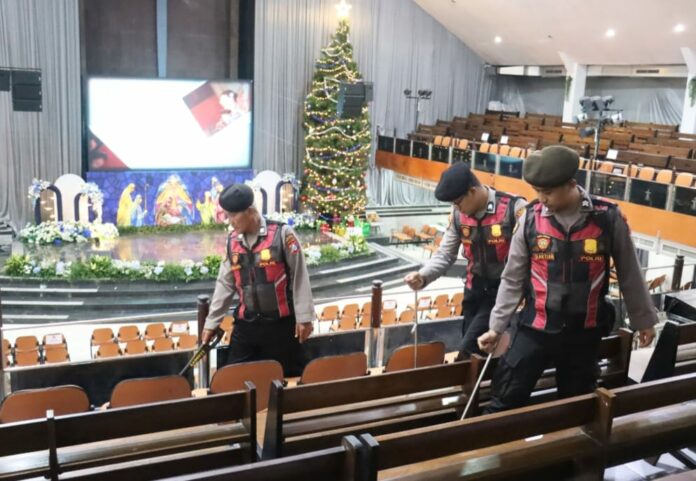 “Personel Sat Samapta Polres Mojokerto Kota melakukan penyisiran secara menyeluruh, baik di dalam maupun di luar area gereja. Pemeriksaan meliputi ruang ibadah, altar, halaman, area parkir, serta fasilitas penunjang lainnya, termasuk properti ritual,” ujar AKBP Herdiawan.