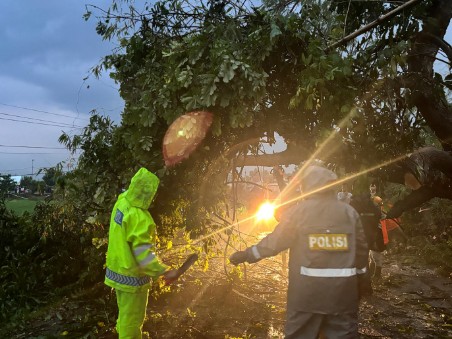 Petugas BPBD Kabupaten Mojokerto bersama TNI dan Polri langsung turun ke lokasi untuk melakukan evakuasi pohon tumbang dan pendataan kerusakan.