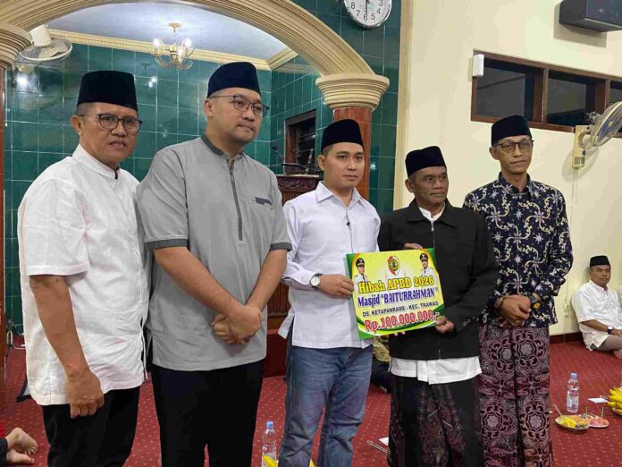Bupati Mojokerto, Muhammad Al Barra, menyerahkan secara simbolis dana hibah Rp 100 juta untuk Masjid Baiturrahman.