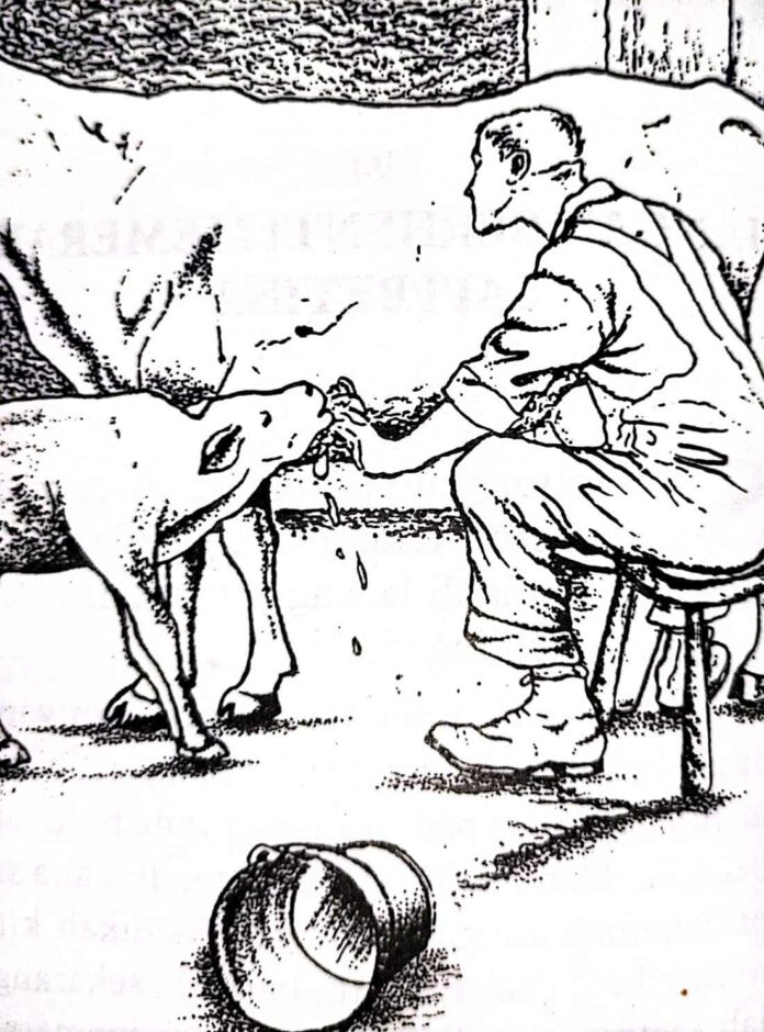 Tetapi, lihatlah anak sapi yang diikat di depan induknya, menginginkan susu. Anak sapi yang malang itu sedang menyusu pada segala hal yang ada di dekatnya. Ia tidak dapat memperoleh susu sedikit pun dengan cara seperti itu!