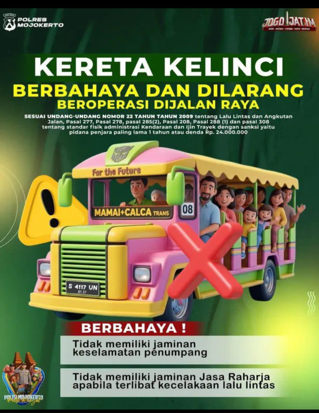 Polres Mojokerto mengimbau masyarakat agar tidak mengoperasikan kendaraan modifikasi seperti odong-odong di jalan umum apabila tidak memenuhi persyaratan teknis dan laik jalan.