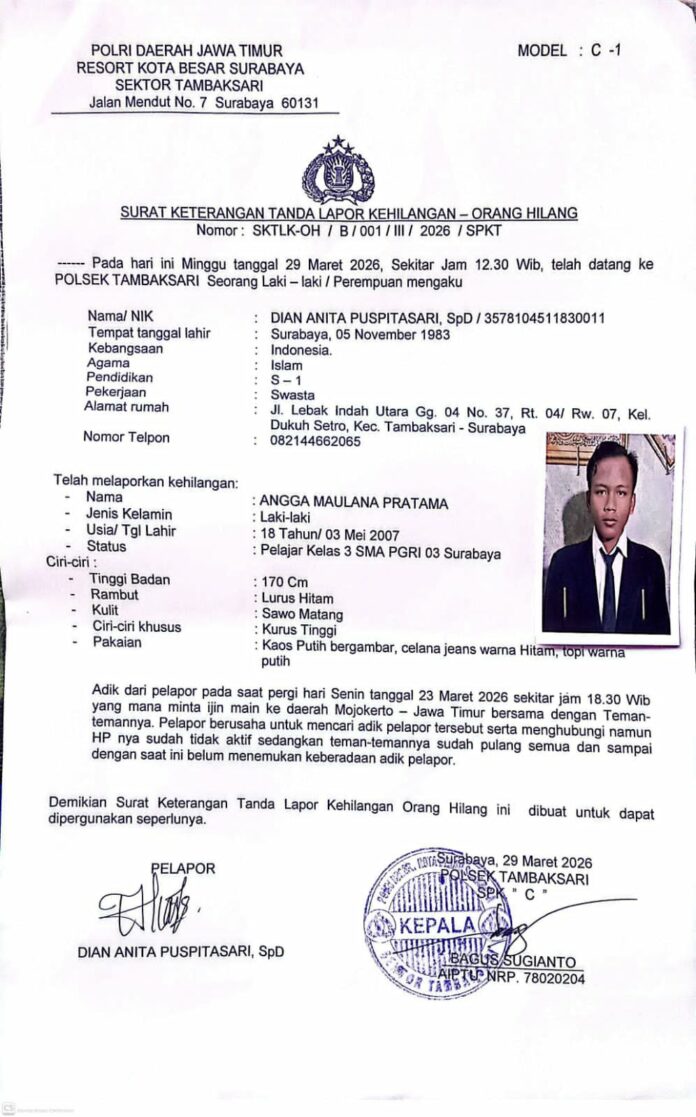 inilahmojokerto.com – Seorang remaja bernama Angga Maulana Pratama (18), warga Lebak Indah Utara 4/37, Surabaya, dilaporkan hilang setelah pamit pergi ke kawasan Pacet, Kabupaten Mojokerto, Jawa Timur. Hingga Minggu (29/3/2026), Angga belum kembali ke rumah sejak keberangkatannya pada Senin (23/3/2026).