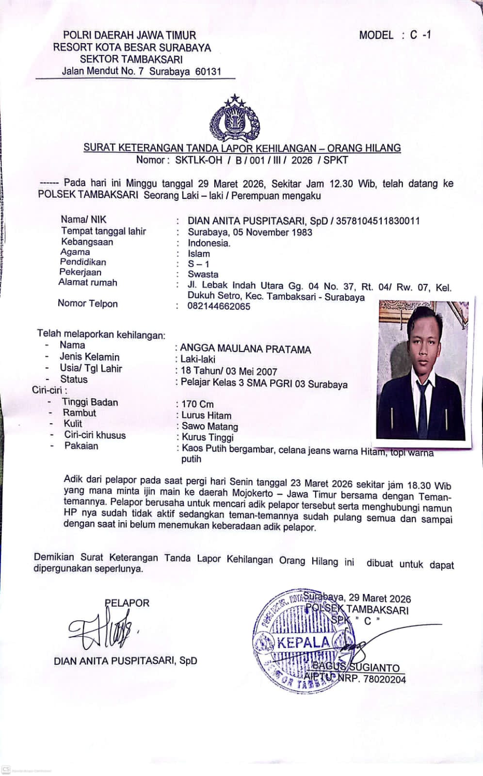 Keluarga berharap masyarakat yang mengetahui keberadaan Angga dapat segera melapor ke kantor polisi terdekat atau menghubungi pihak keluarga melalui nomor 0821-4466-2065.